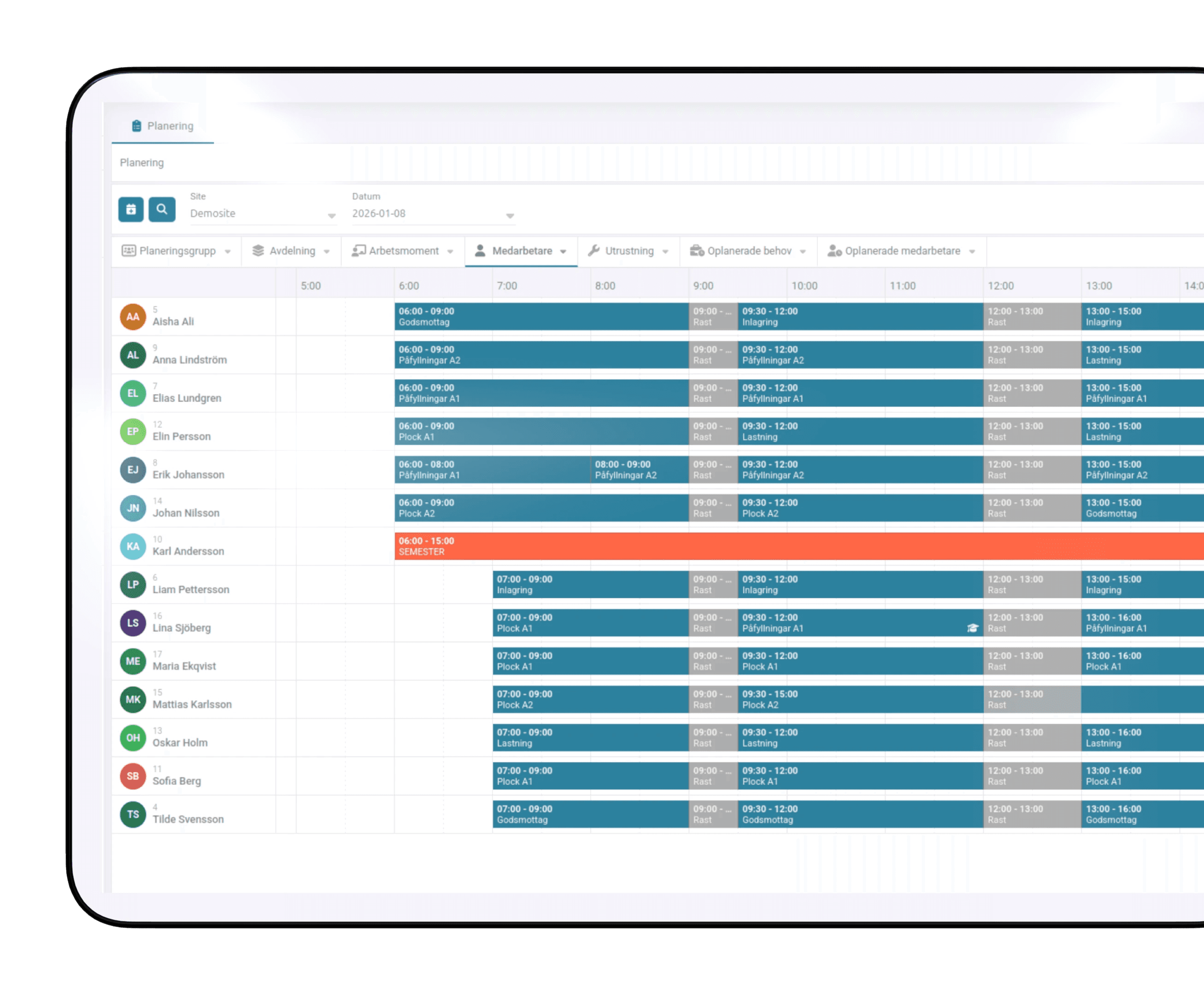 Plan säkerställer att rätt resurser finns på rätt plats vid rätt tidpunkt. Modulen ger en tydlig översikt baserad på volymer, scheman, kompetenser, utrustning, produktivitetsnivåer och tillgänglighet.